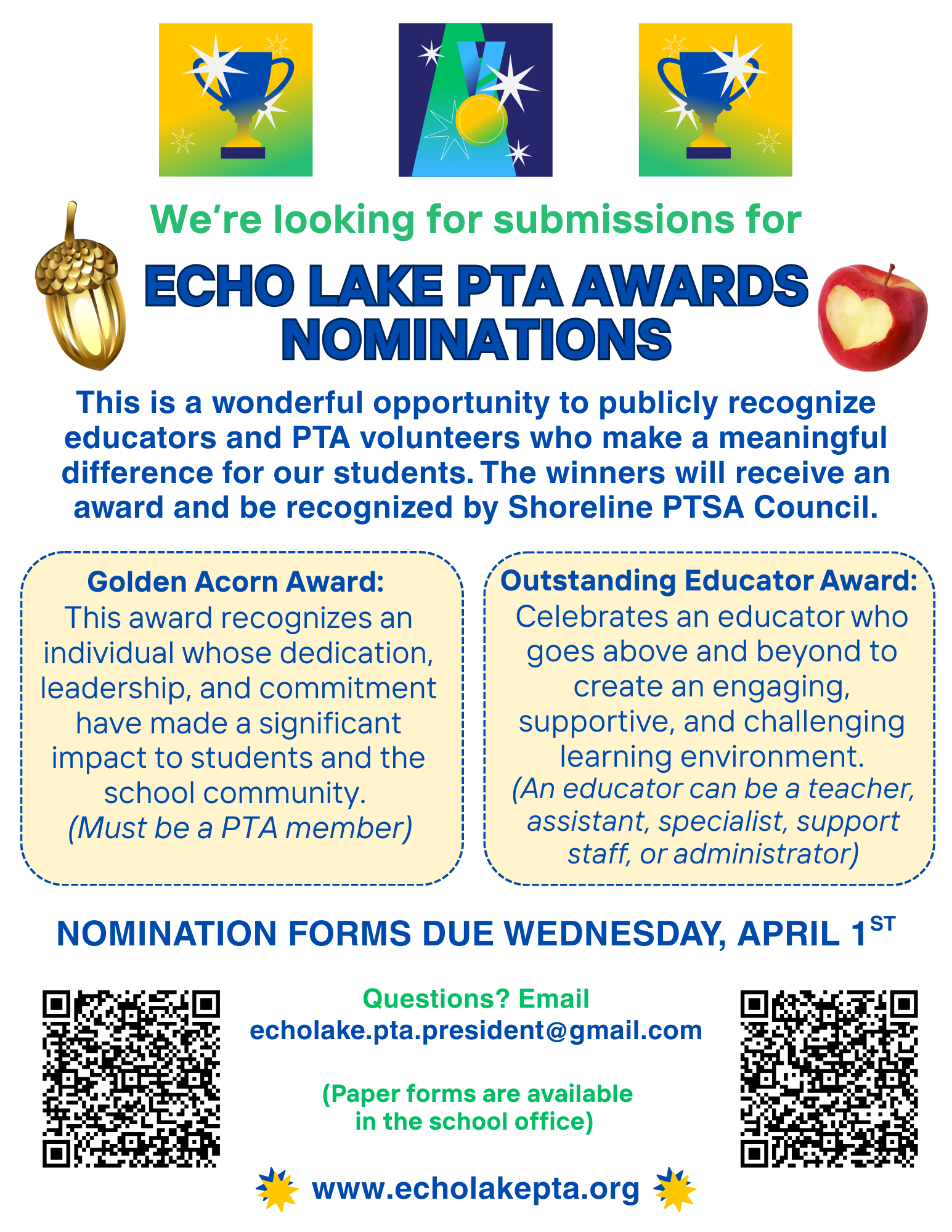 We're looking for submissions for the Echo Lake PTA Awards Nominations!